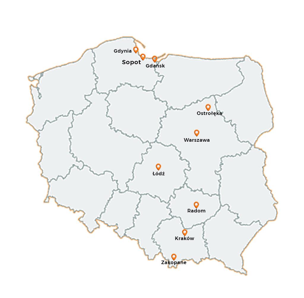 Działamy w 9 miastach: Gdańsk, Gdynia, Sopot, Warszawa, Radom, Ostrołęka, Łódź, Kraków i Zakopane.